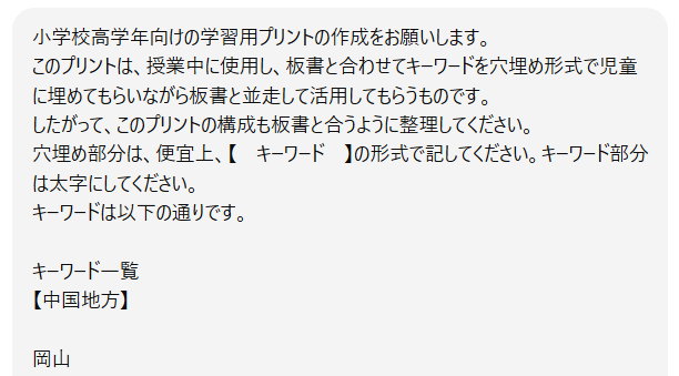 今回は、これらのキーワードを学習範囲として、学習用プリントを生成AIを活用して作成してみます。