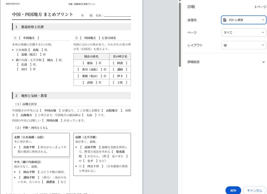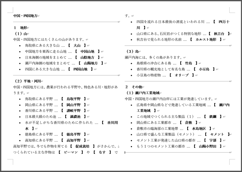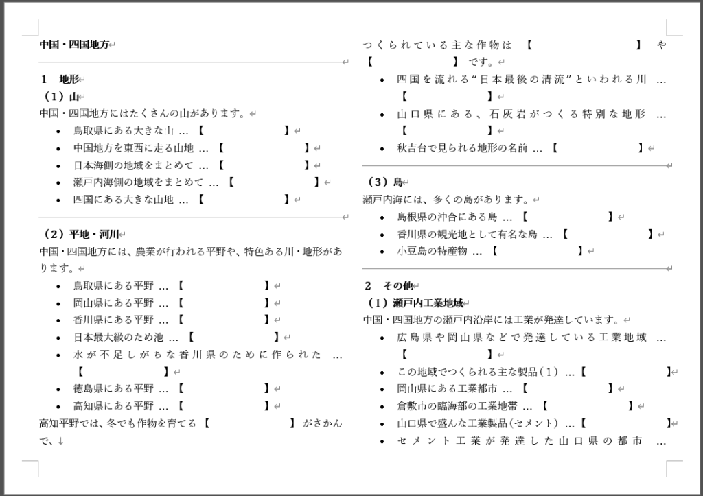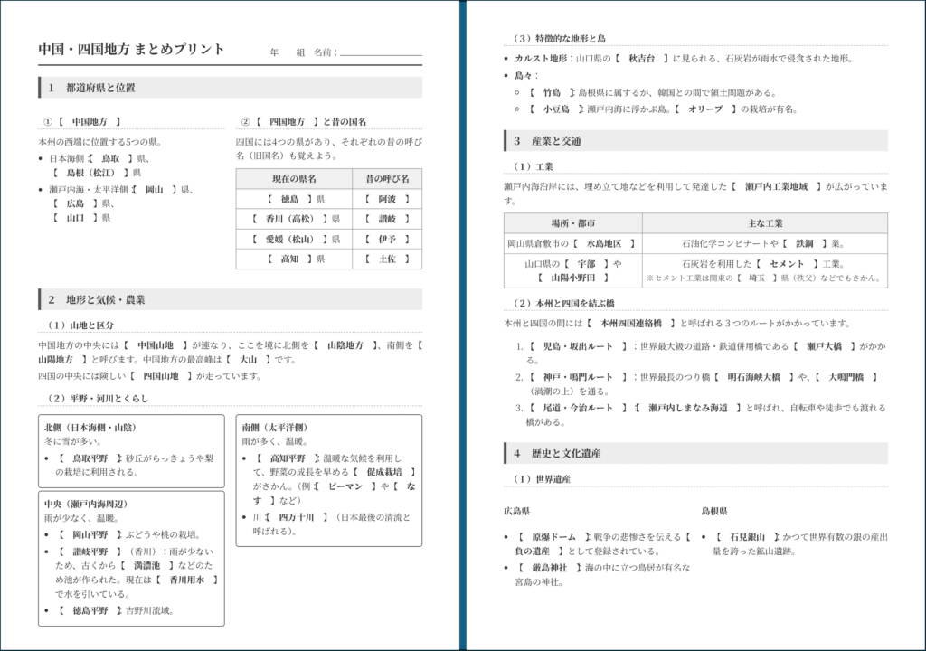 今回は、小学校高学年向けの日本の地理「中国・四国地方」に関しての範囲で、学習用プリントを作成してみます。