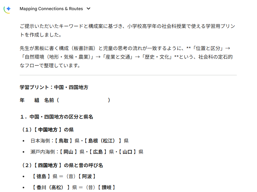 | 地図活用 | 「『地図帳で確認しよう』という作業指示アイコンを入れる場所を提案して」 | プリント作業だけでなく、地図帳を開くアクションを誘発できる。 |