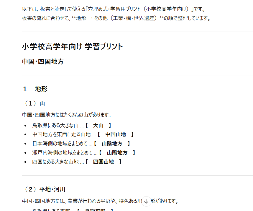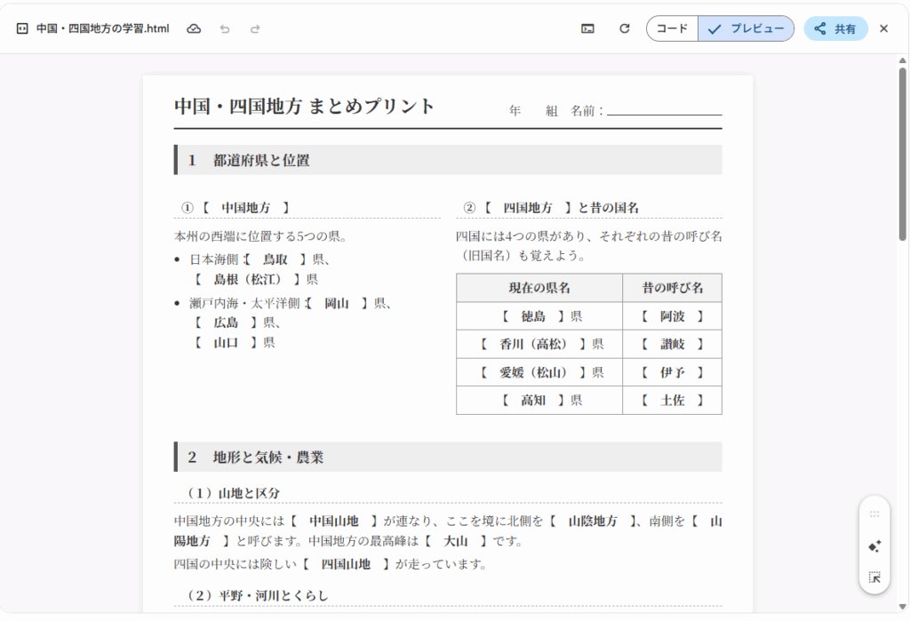 | 思考を促す | ・「単なる暗記ではなく、『なぜそうなったか』(理由)を問う記述欄を設けて」 ・「この地域の特色を一言でまとめる『まとめ』の欄を作って」 |