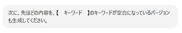 「次に、先ほどの内容を、【 キーワード 】のキーワードが空白になっているバージョンも生成してください。」