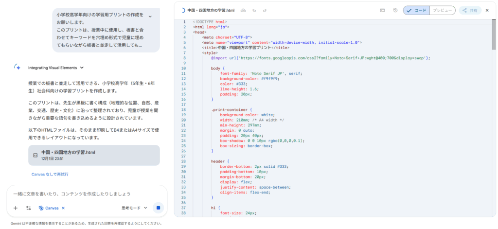 すると、下図のようにGeminiではHTMLで学習プリントを作成してくれました。