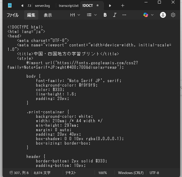 コピーしたコードを、PCのメモ帳などに貼り付けて、名前を付けて保存し、拡張子を.htmlに変更したうえで、ファイルを「プログラムから開く」からChromeなどのブラウザで開くと、先ほどGeminiのプレビューで表示されていた学習用プリントの内容をブラウザでも閲覧することができ、印刷やPDFへの保存も簡単に行えます。