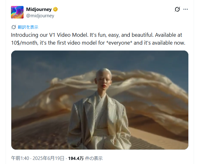 テキストから画像生成で有名なMidjourneyは初のビデオモデル「V1 Video」をリリースしました。ユーザーは4秒単位で画像から動画への変換やモーションの指定ができ、外部画像のアニメーションも可能です。