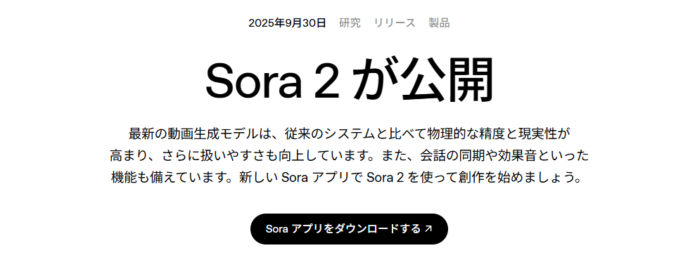 OpenAIは9月30日、物理的制約や音声同期を向上させた映像生成モデルSora 2と専用アプリを発表。複雑な動きを伴う動画や音声付き映像をリアルに生成できるとし、より安全に利用できるよう制御機能を強化しました。