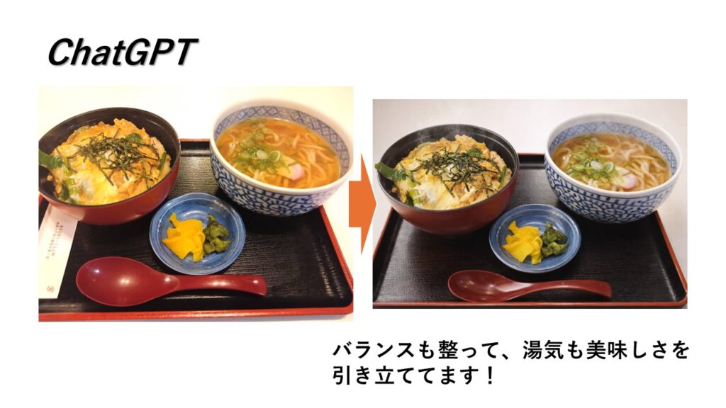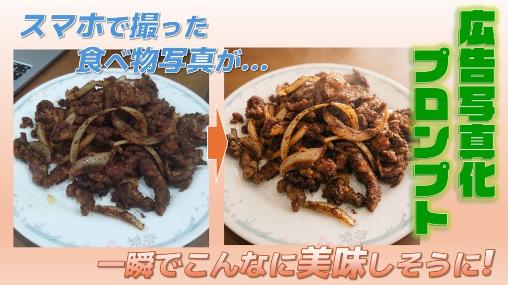 インスタをやっている飲食店や、自社製品をもっと美味しそうに見せたい企業にとって、カメラマンを雇ってプロの仕上がりに撮影してもらうのも、費用的になかなか厳しいところもあるかもしれませんが、このプロンプトを使えば、スマホで撮影した食べ物の写真でも一瞬で「おいしそう!」な仕上がりにすることができちゃいます!