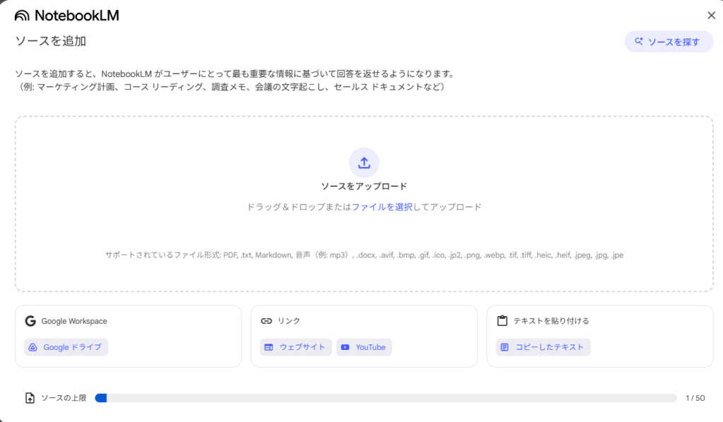 NotebookLMの中核となるのが「ソース」機能です。ソースとは、AIに学習させる情報源のことで、以下のような多様な形式に対応しています。