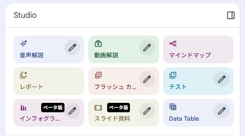 NotebookLM Studioは、アップロードしたソースから様々な形式のコンテンツを自動生成できる強力な機能群です。