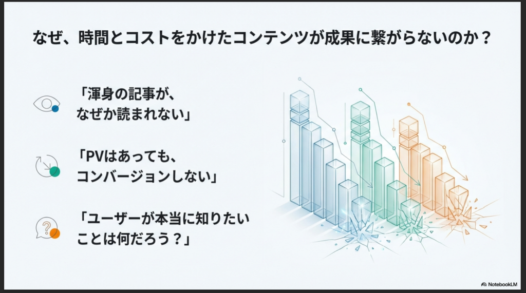 マーケティング分野においては、コンテンツ制作の量と質の両立が課題になりがちですが、NotebookLMを活用することでこの問題にも対応できます。市場データや既存記事、調査レポートなどを基に構成案や要点整理を行うことで、SEOを意識した記事企画や下書きを効率的に作成できます。これにより、限られたリソースでも継続的にコンテンツを発信できる体制を構築しやすくなります。